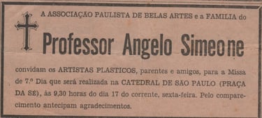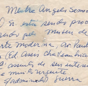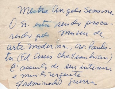 "Mestre Angelo Simeone, o sr. está sendo procurado pelo Museu de Arte Moderna, av Paulista (Ed Assis Chateaubriand). É assunto de seu interesse e muito urgente. seu admirador Guerra" Bilhete em guardanapo de um aluno sobre a procura de Angelo pelo Masp para conversar sobre a exposição: