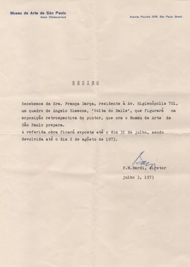 "Recibo" de quadro emprestado por uma colecionadora para a exposição do quadro "Volta do Baile", ganhador de Grande Medalha de Ouro no Salão Paulista de Belas Artes. Assinado por Pietro Maria Bardi, então diretor do MASP